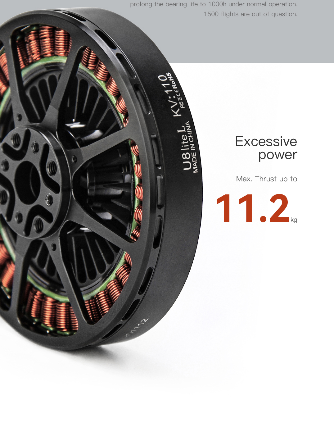 T-MOTOR U8 Lite L KV110 delivers exceptional thrust up to 11.2kg with an ultra-light design for extended flight durations. Built with imported custom bearings, it features a redesigned structure tested for axial and radial stresses, ensuring a lifespan of 1,000 operational hours and up to 1,500 flights. Its advanced magnetic circuit matches the efficiency of the U8 Lite, offering unmatched power and reliability.
