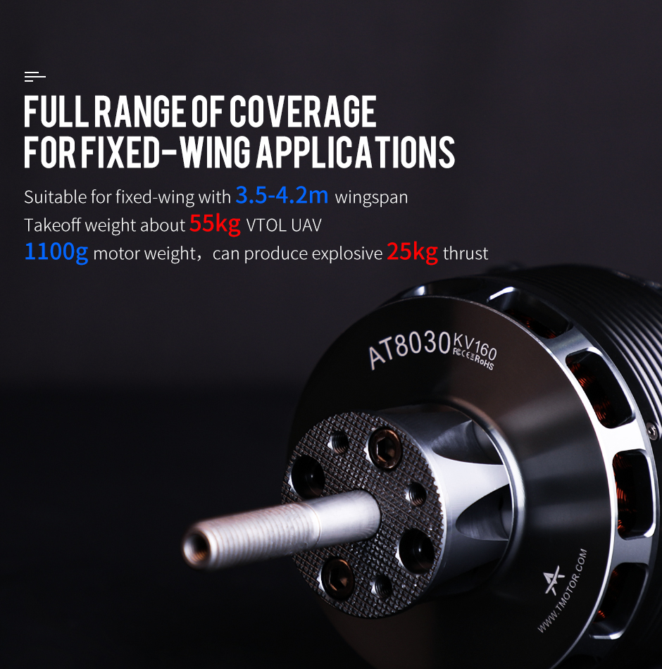 AT8030 is a hi-end motor suitable for VTOL UAV fixed wings with a wingspan of 3.5-4.2m and a take-off weight of about 55kg.