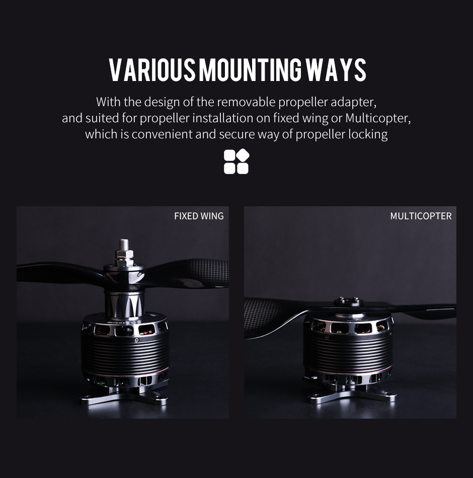 2.The detachable propeller seat is suitable for the installation of fixed-wing and multi-rotor props, providing convenient and safe propeller locking. Method