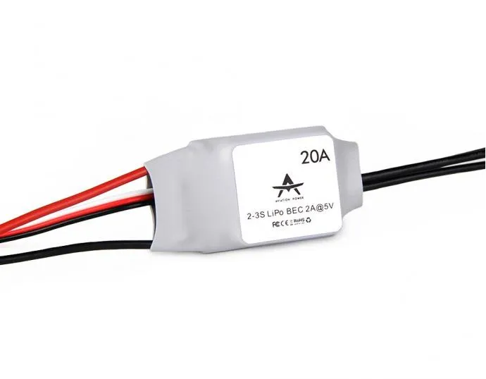The AT20A is a fixed-wing electric regulator with a linear voltage regulator scheme, supports 2-3S lithium batteries and weighs 19 grams. The maximum peak current is 25A.