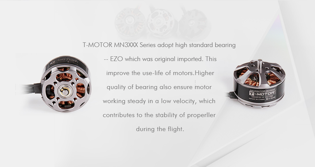 T-MOTOR MN3510 KV360/KV630/KV/700 Navigator Series brushless motor is designed for superior performance in UAV applications. With oversized high-quality ball bearings, it ensures smooth, stable operation at low speeds and withstands pressure for enhanced frame stability. Featuring a maximum thrust of 2.2kg and an MTBF of about 1000 hours, the MN3510 offers exceptional balance and durability. Ideal for multi-rotors, VTOL, and fixed-wing UAVs, it combines precision engineering with high-strength construction for reliable, long-lasting performance.