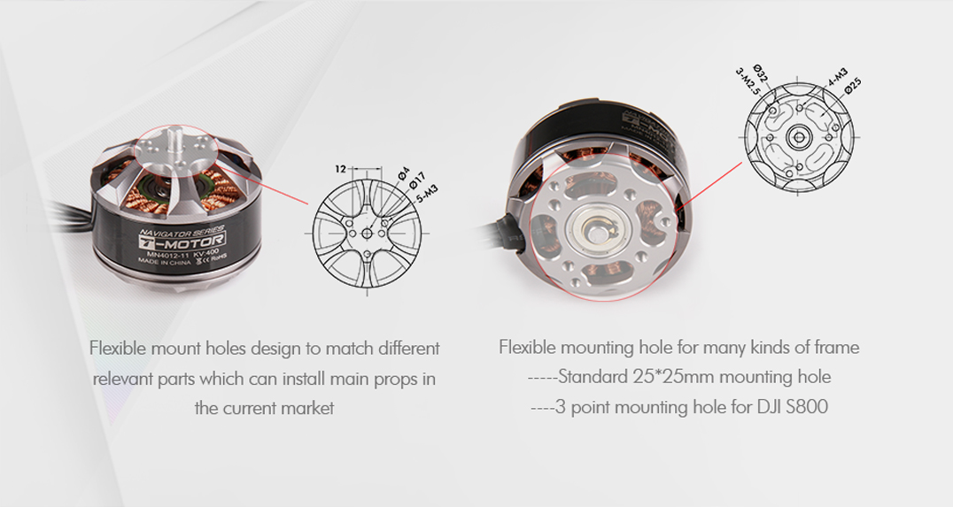 "Navigator" motors are for general uses like aerial photography. For demand of multi-rotors, VTOL and fixed wings.