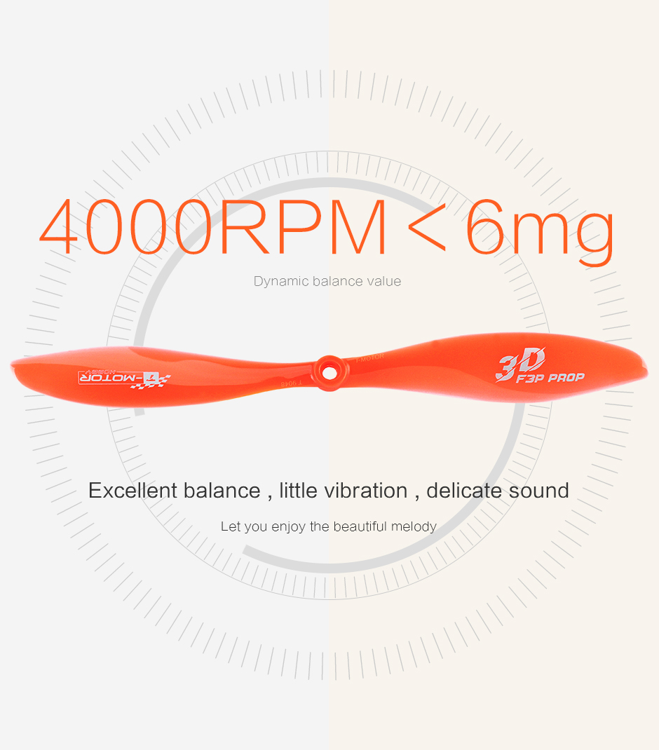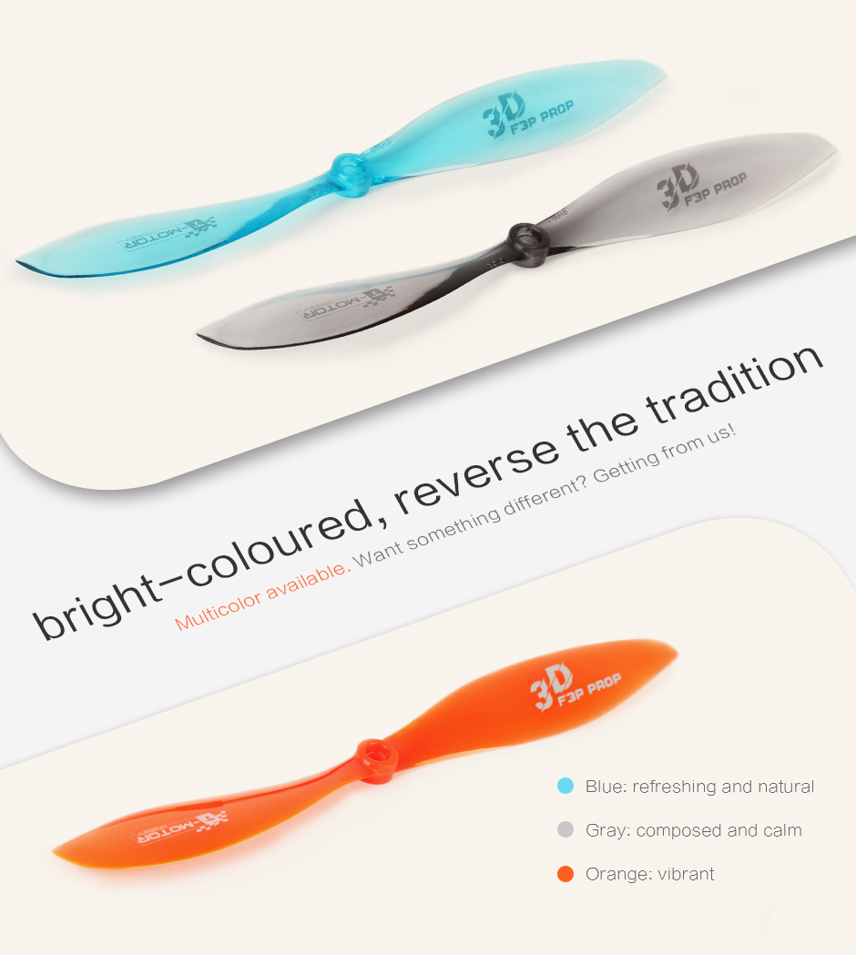 1.Plastic propeller, with three colors: blue、gray and orange、and the weight of a single piece is only 5.99 grams、suitable for F3P 3D flight