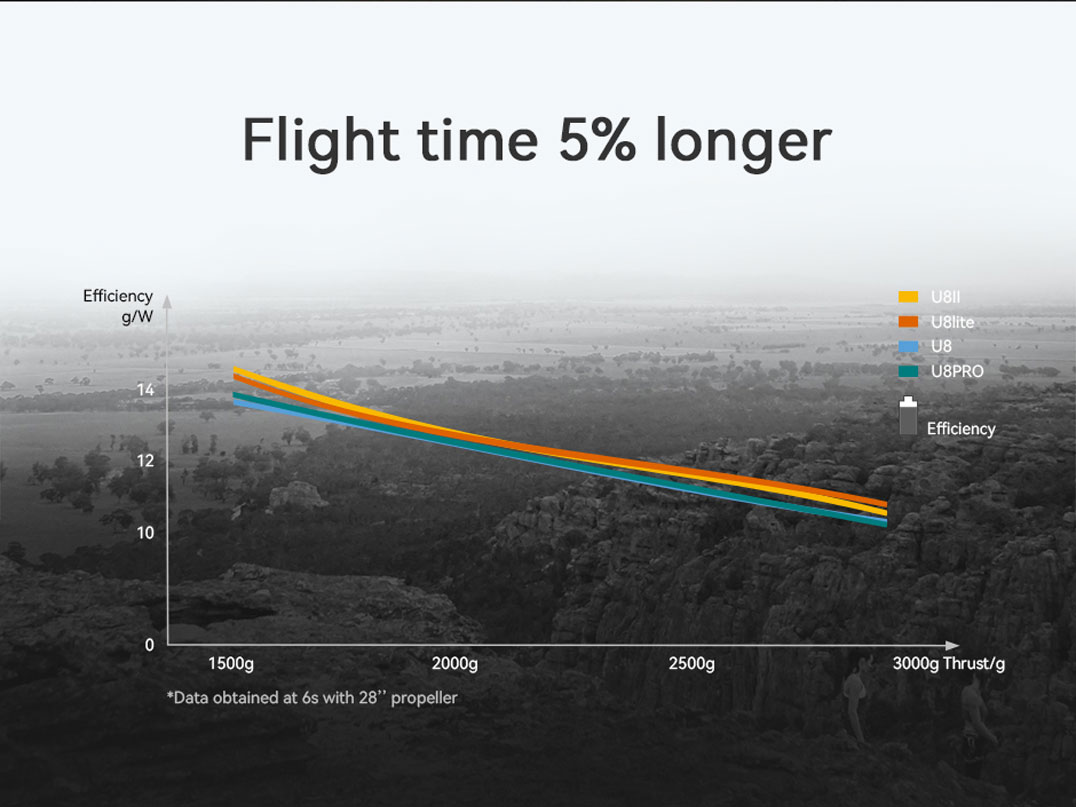 "U Efficiency" motors (from U-series) are aimed for high end UAVs requiring long endurance. This kind of UAVs are usually for surveillance, cruise, security and protection, surveying and mapping.