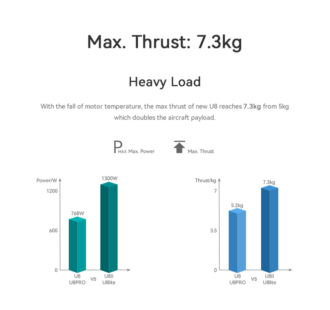 U8lite KV150 | 12S (48V) | T-MOTOR P22*6.6” CF | 40% | 1702 | 0.46 | 3.30 | 2925 | 158 | 10.74 | 56 (Ambient Temperature: 29.1℃) |