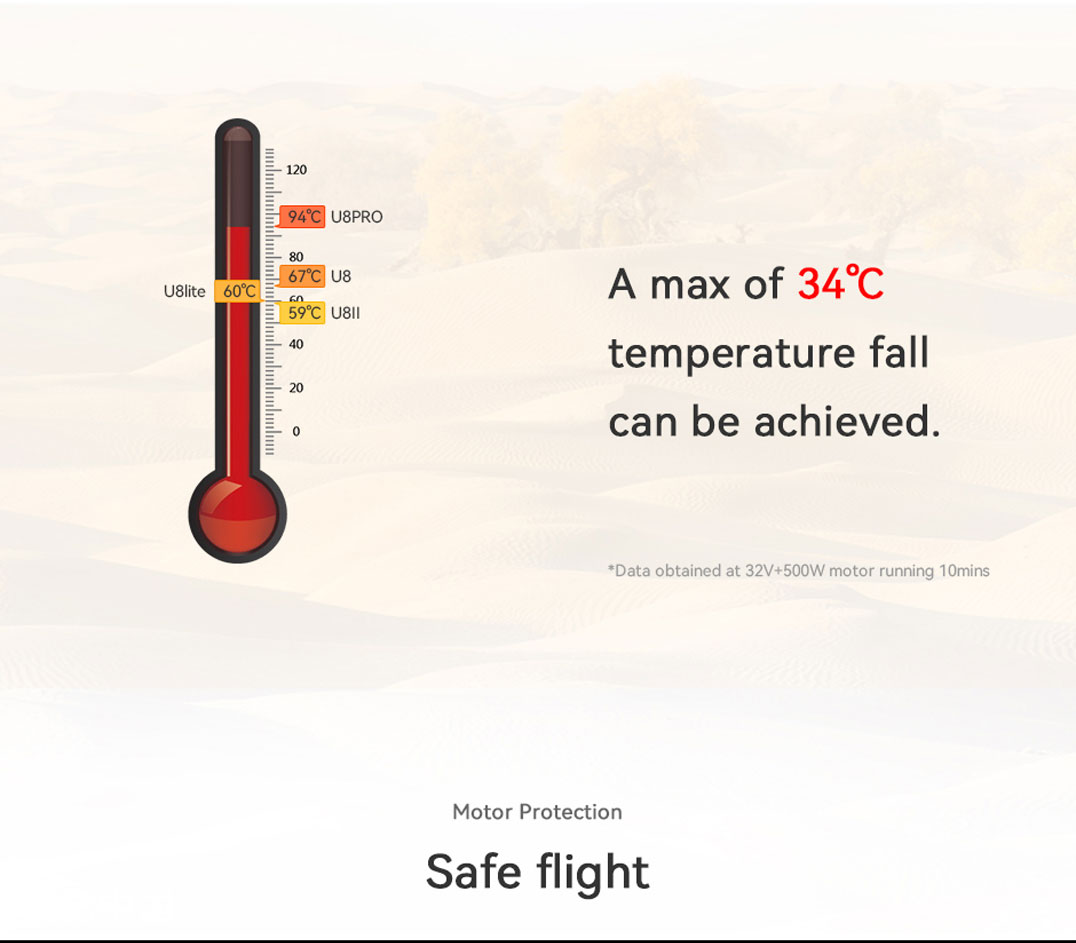 U8lite KV150 | 6S (24V) | T-MOTOR G30*10.5” CF | 40% | 1551 | 0.54 | 3.80 | 1321 | 91 | 17.01 | 103 (Ambient Temperature: 29.5℃) |